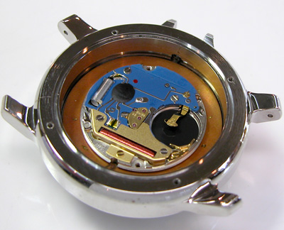 裏蓋は4本ネジ。裏蓋を開けると金属のスペーサーというか耐磁プレートと言うか。