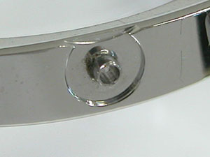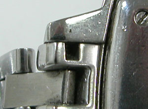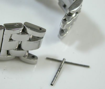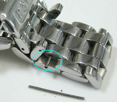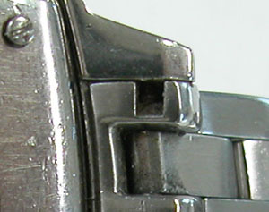 さてバックルから開くことも出来ず、ラグ部のバネ棒も外れないのでベルト調整の要領で開きます。Cリング式ですがピンを抜いても外れ無い?Cリングパイプがコマを貫通しています。この構造は安物では見られない仕様。