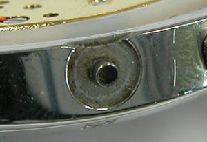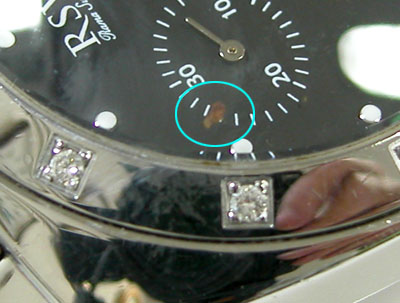 ご依頼内容に「文字盤のゴミ除去」とありましたが結構大きなゴミが。何処から入ったのでしょうか?というご質問ですが。これはガラスから入る事はありえないです。となると電池交換で裏蓋を開けたが為に入ったとしても、文字盤に回る事はありません。(雑貨ウォッチならありえますが)。では何故?