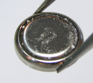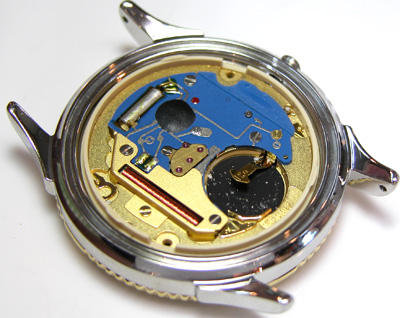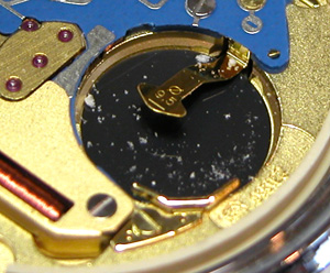 綺麗になったケースにムーブメントをもどして電池格納部をチェックします。