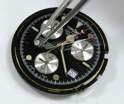 インデックスの取付は完了。赤いクロノ針の夜光修整もご依頼ですが、私では自信はない。OHついでなどがあれば職人さんならやってくれます。