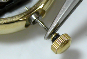 裏蓋を開けると使用感を感じます。先ずは、竜頭を抜いて。