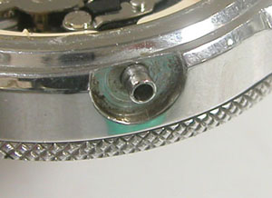 裏蓋はスクリューバックでラグ部のバネ棒もサビで動きが悪いので洗浄します。