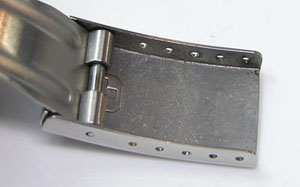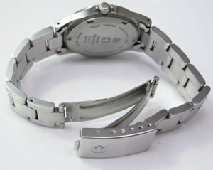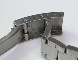 ステンレス無垢バンドに三つ折れバックル。