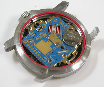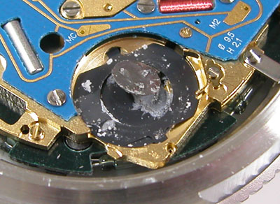 綺麗になったケースにムーブメントを戻して電池格納部をチェックしますが・・。