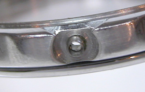 裏蓋の裏側ですがプラスチックパッキンが見えます。このプラスチックパッキンは私らは持っていませんから交換は不可なのです。裏蓋を閉める時に間違って潰さない限りは劣化することも無いのですが。パッキンを外すと汚れが見えます。