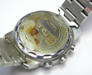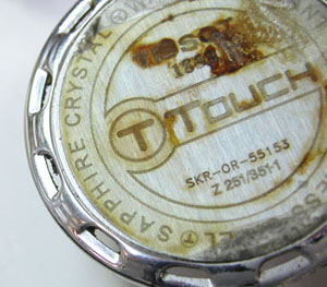 裏蓋のシールはもう剥がさないとシミになって取れなくなります。メッシュ状ですから透けて見えます。