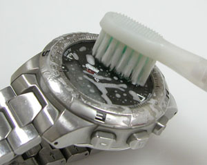 ガラスとベゼルの隙間は超音波歯ブラシで磨きます。