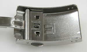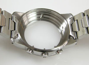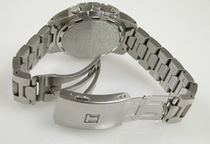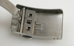 ステンレス無垢バンドに三つ折れプッシュバックル。