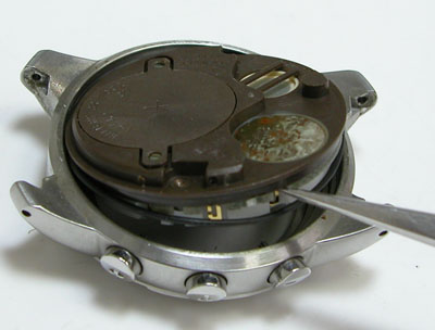 なんとかムーブメント取り出しに成功。茶色いプラスチック部分を持って開けますので堅いとキズだらけになるので諦めますが、浮き上がりました。パッキンが乾燥しきっていると滑らないので開かない訳です。