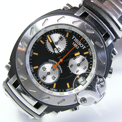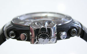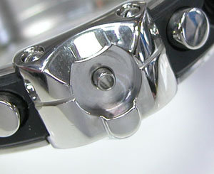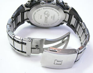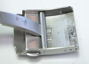 ステンレス無垢バンドに三つ折れプッシュバックル。