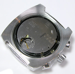 これが取り出した文字盤&ムーブメント。竜頭パイプもチェックします。ボタン回りの汚れが気になりますが、これは洗浄すれば綺麗になるでしょう。