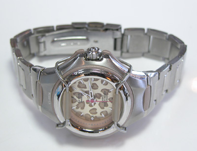 ステンレス無垢バンドに三つ折れプッシュバックル。