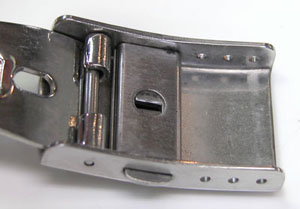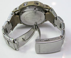 ステンレス無垢バンドに三つ折れプッシュバックル。
