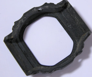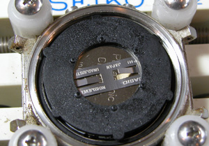 裏蓋を開けるとゴムのスペーサーが見えます。ゴムのスペーサーを取り外しますと、こうなります。G-SHOCKでもかなり古いムーブメントであることが分かります。