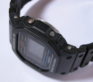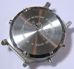 裏蓋はスクリューバック。このモデル表からはウレタン素材の普通の”G"に見えます。でもステンレスの裏蓋だけに目をやってはいけませんね。電池交換の為には裏蓋を覆ったベルトを外すとやはり汚れています。