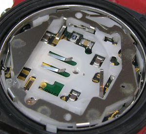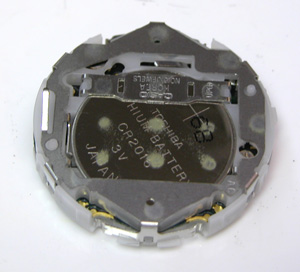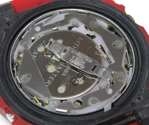 ムーブメントを戻して電池押さえを外します。電池格納部をチェックします。といって異常がある事を見たことは無いのですが。