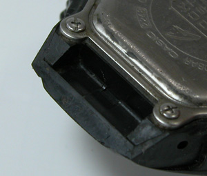裏から見るとこうなっています、ラグ部を覆うように袋状のキャップが付いています。それをサイドのネジで留めてある訳ですが、もちろんバネ棒でも留まっています。こういった袋状になっている限り、こうなるのは仕方がありません。このバネ棒を外すのは難しいですよ。