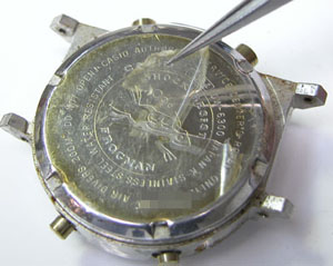 裏蓋を閉め簡易防水テストがてらの洗浄。ですがその前に裏蓋シールは剥がします。