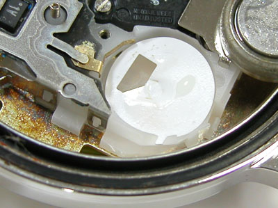 綺麗になったケースにムーブメントを戻して電池格納部をチェックしますが・・・?