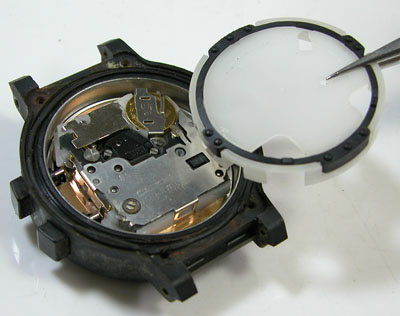 綺麗になったケースにムーブメントを戻して電池格納部をチェックします。注油調整してアナログは動き出しました。