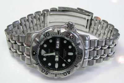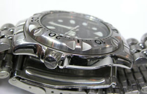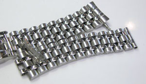 ステンレス板巻きバンドに三つ折れバックルはダブルロック。