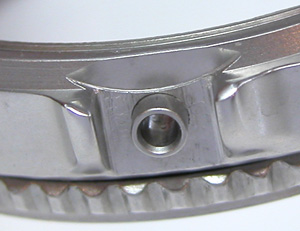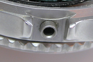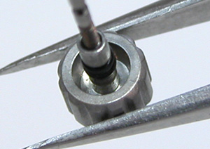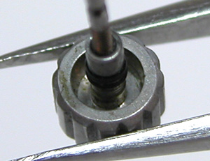 竜頭パイプ裏側もチェックします。この黒いリングがあるとケースの洗浄が・・・おっと裏向けたら落ちて来ました。