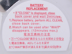 裏蓋を開けるとプラスチックのスペーサーが見えます。私はまだ一度も”CLOSE”表示を見た事がありません。またリセット後の”WAIT”表示を見た事も無い。よって最大12分も待った事がありません一体、何をした時にそのような表示になるのか・・?