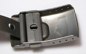 バックルもチタン無垢の重厚さ。裏蓋はスクリューバック。