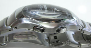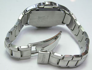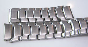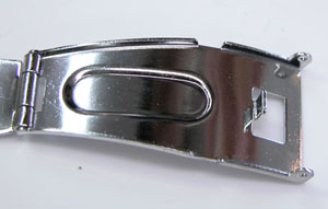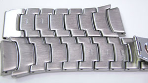 ステンレス無垢バンドに三つ折れプッシュバックル。