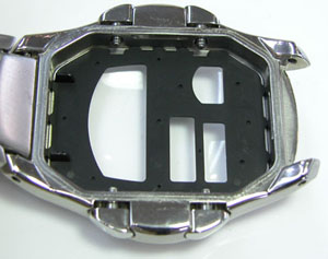 内部をチェックすると黒いプラスチックの板に字がプリントされていますから洗浄で文字が消えそう。そこで裏蓋をして防水テストがてらの洗浄。