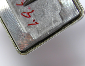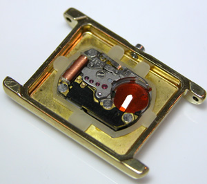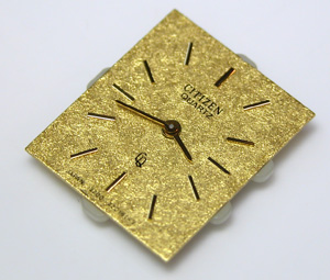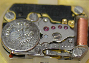 角度を変えて。拡大。CITIZENも昔のクォーツは赤い石が使われたムーブメントだったのですね・・