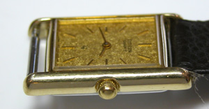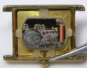 ムーブメントを戻して電池交換。新しいパッキンを入れて電池交換、新しい革ベルトを取り付けて完了です。