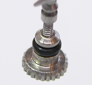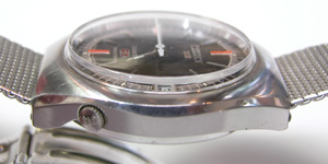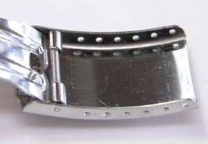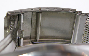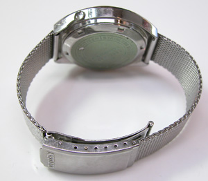 ベルトはメッシュバンドに三つ折れバックルはオリジナル。バックルの裏側には自分で微調整が出来てバネ棒が飛ばない工夫がされています。またこのアジャスターを外すと更に詰める事も可能。