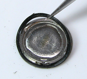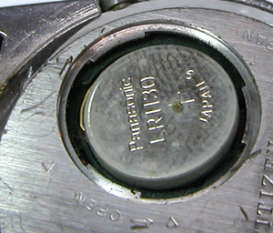電池蓋を開けると電池までが湿気ていますね・・・それに”LR1130”とは(v_v)マイナス側は綺麗なものです。