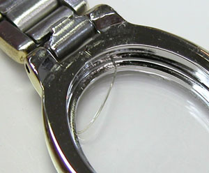 ですが糸のような物が?。ガラスの接着剤が硬化したものですが前回に塗りすぎていた様でその分が剥がれた感じです。これを除去してガラスを裏側から突いても微動だにしない。