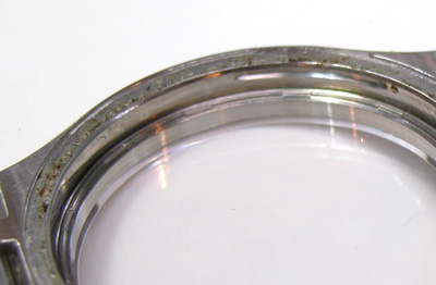 ケースの腐食が目立ちますね・・・電池交換の度に裏蓋とケースの接触面を拭いてパッキン交換すれば、こういう事にはならないのですが。そこまでする方は居ないですね。