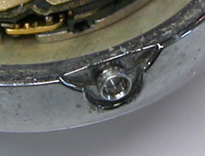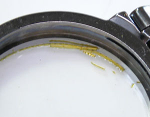 ガラス外れの前兆とガラスとケースの隙間のゴミが洗浄でも落ちません。ガラスを外してみようと乾いた接着剤を削り落としてもはみ出た接着剤のようでガラスは外れませんからそのままいくことに。