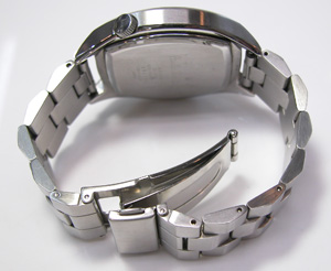 ステンレス無垢バンドに三つ折れプッシュバックル。