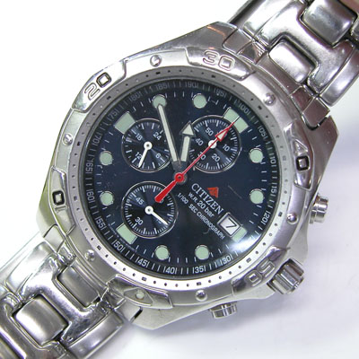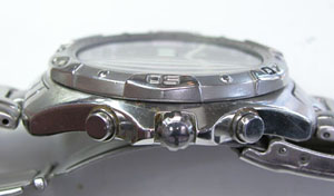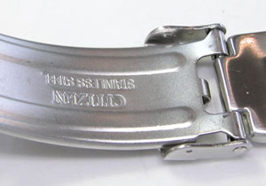 ステンレス無垢バンドに三つ折れダブルロック。回転ベゼルに、ねじ込み竜頭はダイバー仕様。