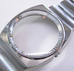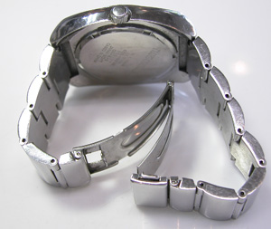 ステンレス無垢バンドに三つ折れプッシュバックル。