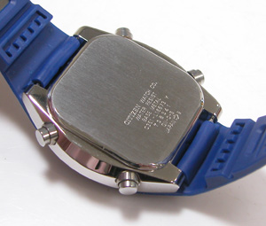 ブルーの文字盤を外さないとケースの洗浄が出来ませんが、プッシュボタンが裏蓋から見てもサビで固着しております。