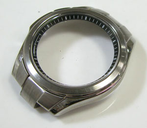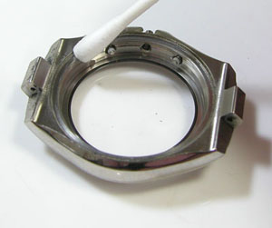ガラスの内側に目盛のリングがありますから、そのまま洗浄は出来ない。裏蓋を閉め簡易防水テストがてらの洗浄になりますからパッキンにシリコン塗布をして裏蓋に戻します。