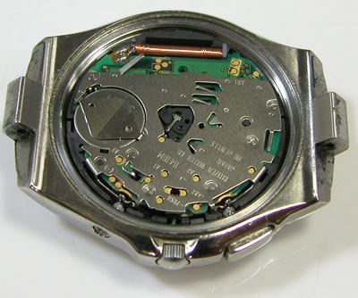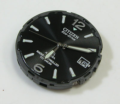 これが取り出した文字盤&ムーブメント。取り出した時は秒針は停止。