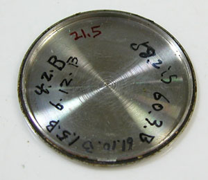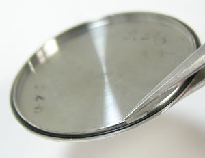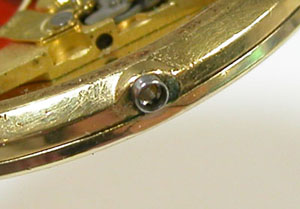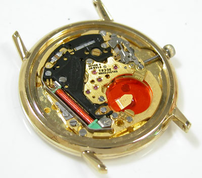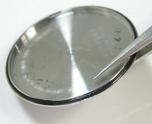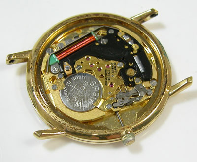 綺麗になったケースにムーブメントを戻して電池格納部をチェックします。油分がないので念の為に注油調整。(注油調整はあくまでもその場しのぎですから、後日不具合がある場合はOHとなります。)