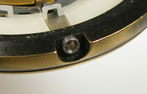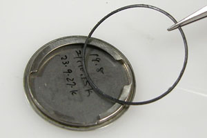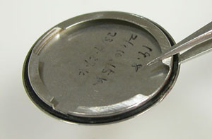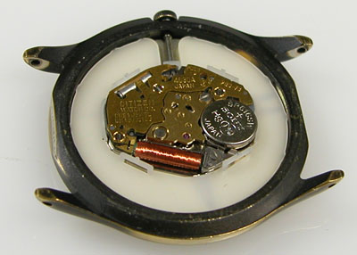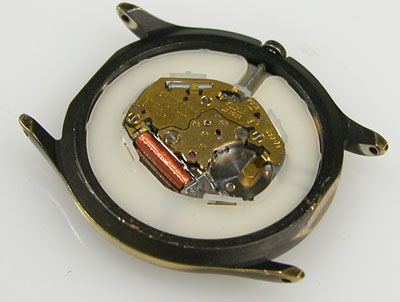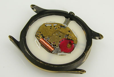 綺麗になったケースにムーブメントを戻して電池格納部をチェックしますが絶縁フィルムが無い。当然、電池を入れても動きません。