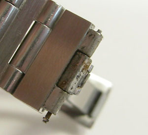 ラグ部を外すとバネ棒が曲がっておりますが、ベルトの形状からバネ棒に負荷が掛かると先端にのみ掛かり先端が曲がります。となると伸縮しないのでバネ棒が外せない=「バンドが外せない」状態になります。
