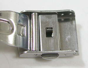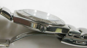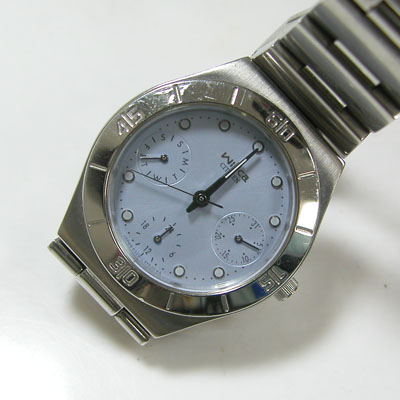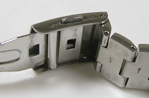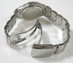 ステンレス無垢バンドに三つ折れプッシュバックル。