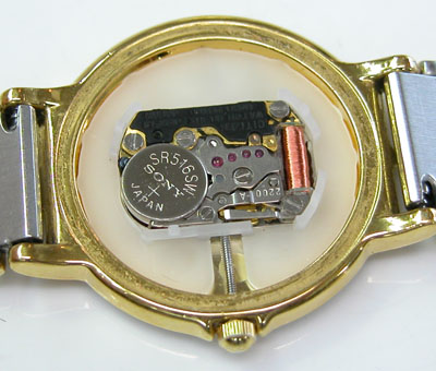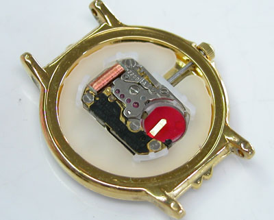 綺麗になったケースにムーブメントを戻して電池格納部をチェックします。電池を入れて動作確認ですが不動。注油調整で動き出しました。本来はOHしたほうが良いのですが。