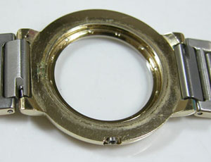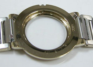 ケースの内側もチェックします。見ただけでメッキの薄さが分かりますからバフ掛けは出来ません。よってクロスで軽く磨いて洗浄ですか。